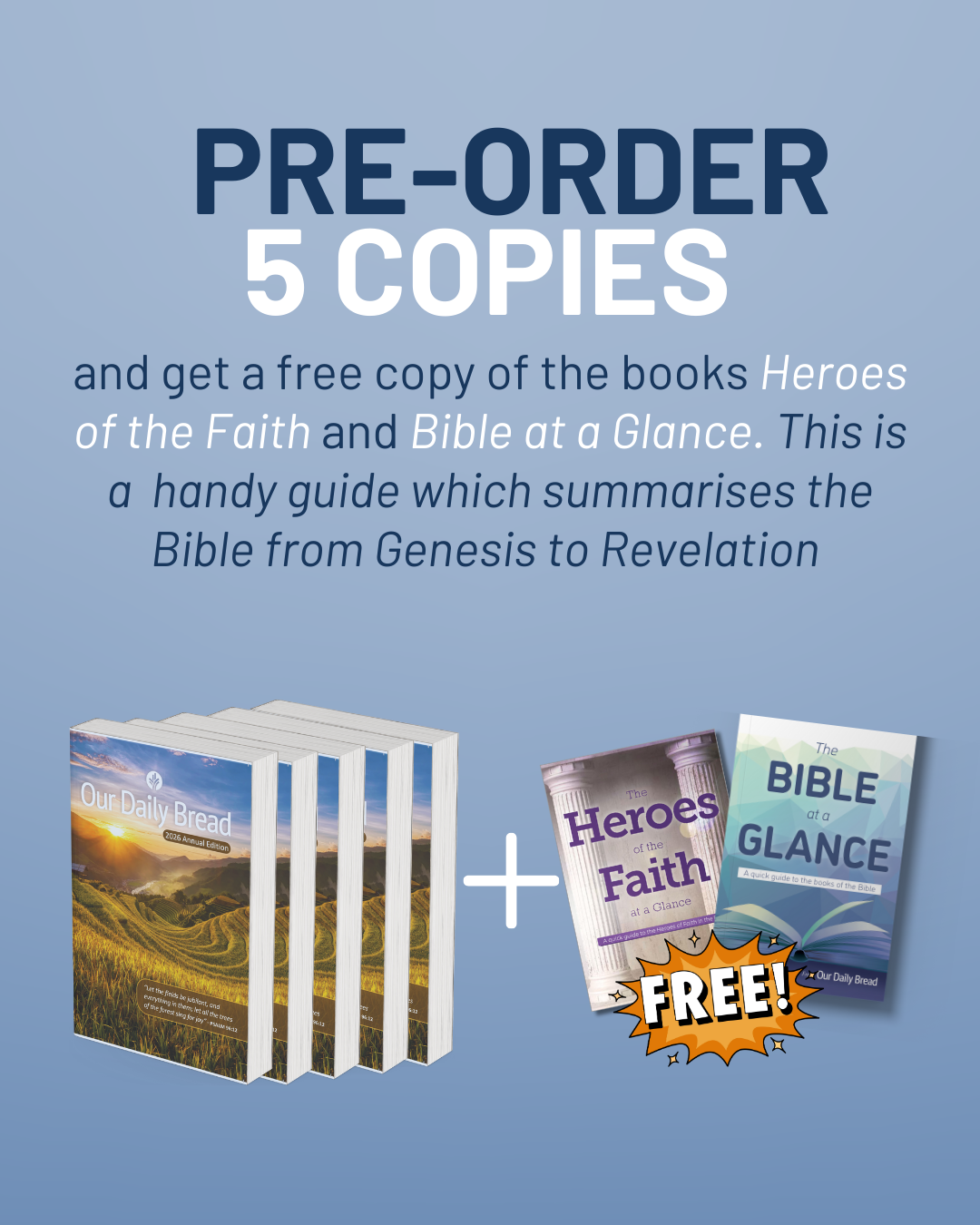 PRE-ORDER 5 COPIES and get a free copy of the books Heroes of the Faith and Bible at a Glance. This is a handy guide which summarises the Bible from Genesis to Revelation.