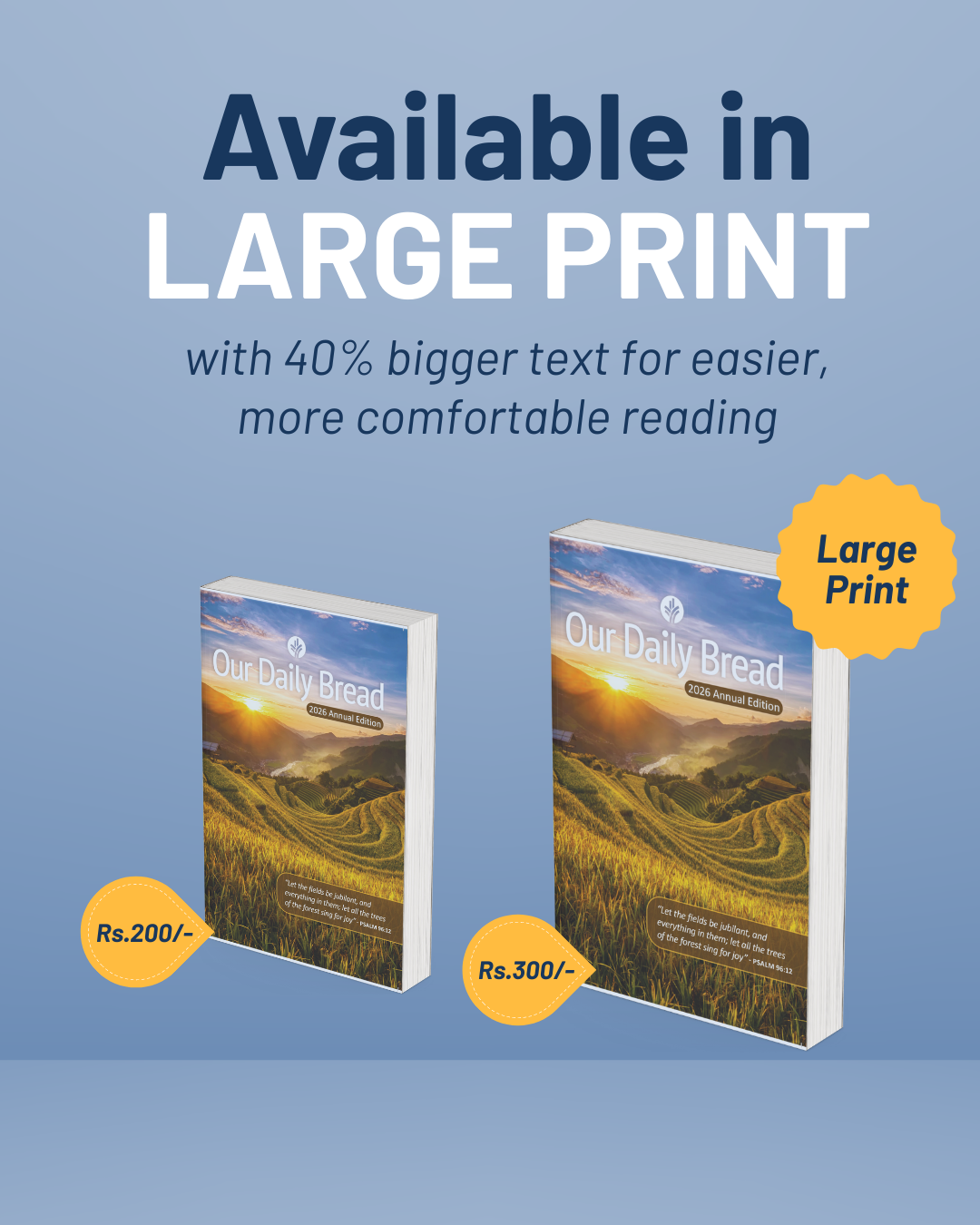 The easy-to-read Large Print edition is now available with text that is 40% larger than the regular print, it provides the reader with a more comfortable reading experience, making it easier to spend your quiet time with this beloved devotional.