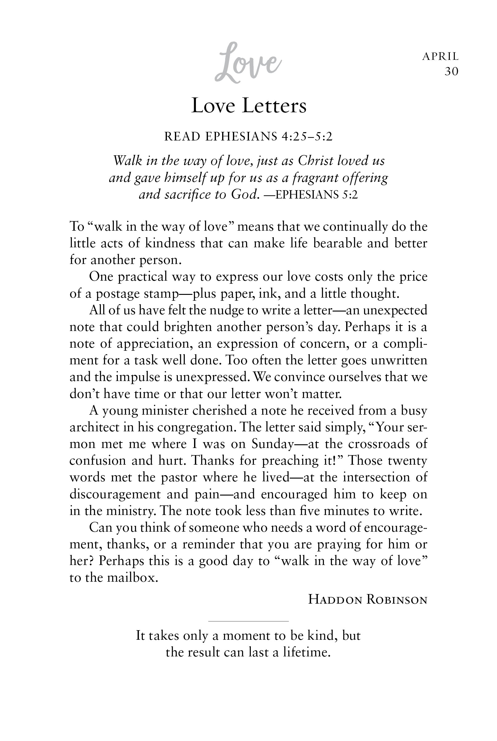 Presenting a year long devotional journey filled with inspiring meditations based on faith, hope and love - with an emphasis on love, the central theme of God's message to the world. Each day offers you confidence and encouragement, through a combination of scripture, engaging stories and compelling quotes.